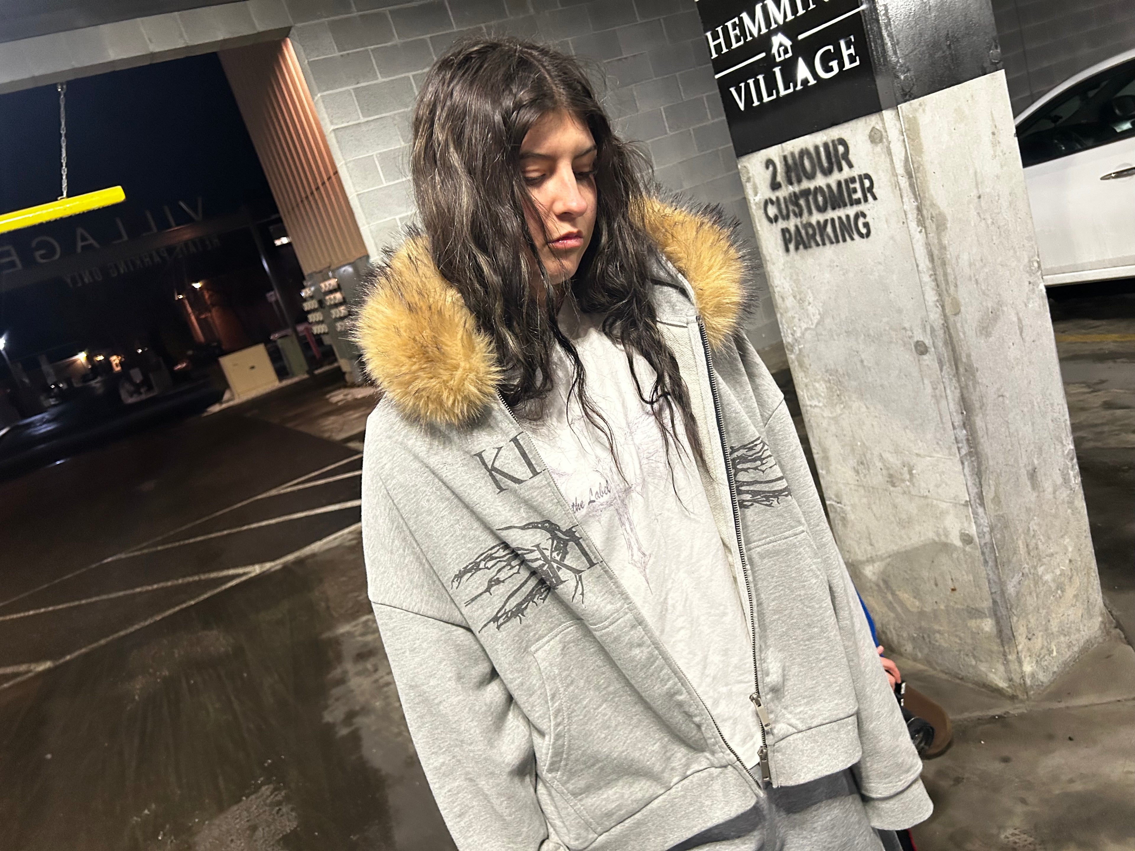 The "KIILL" Fur Hood is a cropped, loose-fit zip hoodie made from 100% cotton 400 GSM fleece in gray. Heavy feel, cl...